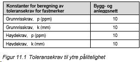Bygg- og anleggsnettet skal oppfylle toleransekrav til ytre pålitelighet i grunnriss og høyde som angitt i NS 3580, se figur 11.1.