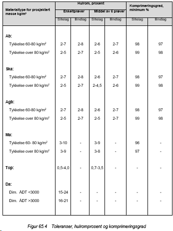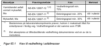 Kontroll av asfaltarbeider skal utføres i henhold til Teknologirapport TR 2505, Reseptorienterte asfaltkontrakter, Vegdirektoratet. Byggherren forbeholder seg rett til å supplere og endre kontrollprosedyrene i byggetiden dersom dette skulle vise seg nødvendig. Nødvendig materialkontroll kan enten utføres ved godkjent prøvningsanstalt eller ved entreprenørens byggeplasslaboratorium. Dette skal være utstyrt og godkjent for de aktuelle prøvninger. Prøvningene skal utføres av tilstrekkelig kvalifisert og øvet personell. Byggherren skal ha fri adgang til entreprenørens laboratorium og prøveresultater.